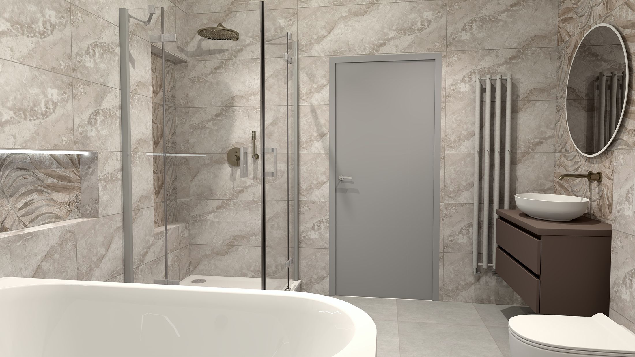 Obklady a dlažba série Keraben Idyllic v designu mramoru, který je synonymem elegance a exkluzivity. Vana Santech New Time Gemini XL pro ještě větší pohodlí. Neobvyklý a prostorově nenáročný koupelnový radiátor P.M.H. Rosendal. Vše skvěle doplňuje koupelnová skříňka Opera Duo pro umyvadlo na desku se dvěma zásuvkami.