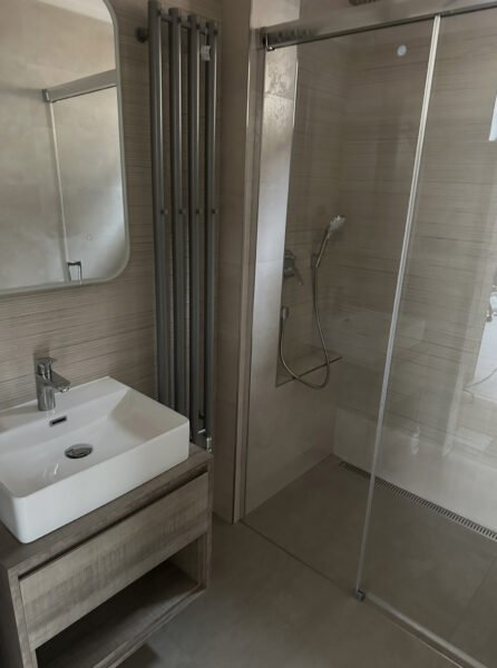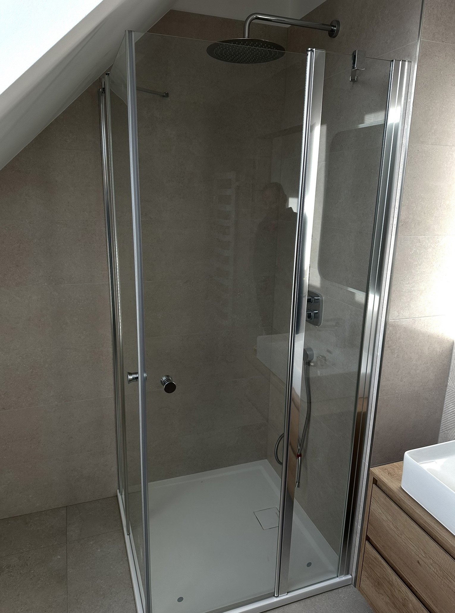 Obě koupelny jsou vybaveny sprchovými kouty od společnosti Ronal a propojuje je důraz na detail, čisté linie a celkové sladění prostoru.