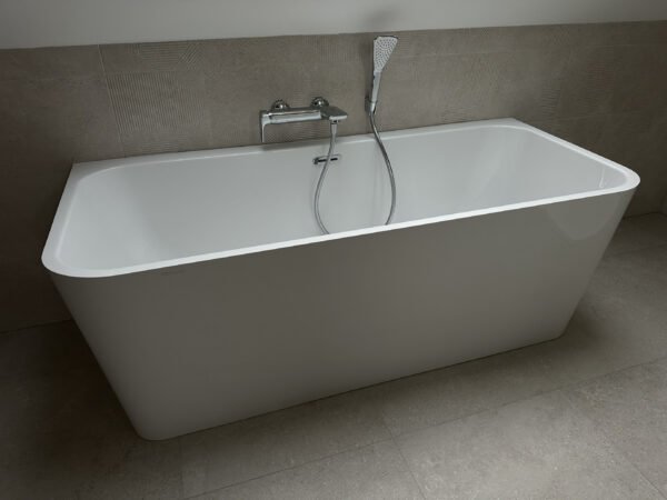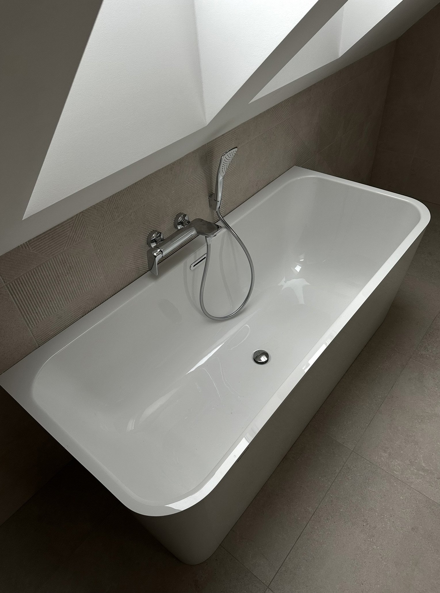 V horní koupelně byly použity obklady od španělského výrobce Keraben ze série Verse, které tvoří klidný a nadčasový základ celého prostoru. Ten je doplněn o volně stojící vanu od české značky Santech, která koupelně dodává výrazný designový prvek.
