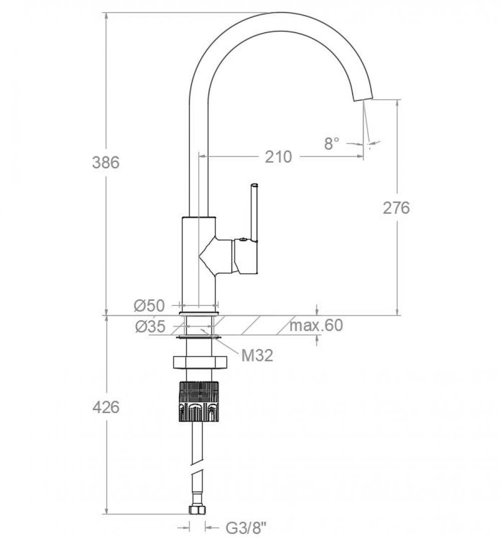 Dřezová baterie značky Ramon Soler, výška 386 mm, otočný výtok o 360°, systém S2 s úsporou vody 50 %, omezovač teploty a patentovaný antikorozní systém.