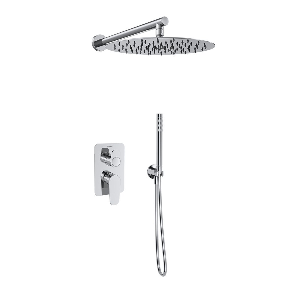 Jednopáková podomítková sprchová baterie značky Ramon Soler, 2cestná, s 300mm kulatou kovovou sprchovou hlavicí a ruční sprchou. Omezovač teploty Thermostop a patentovaný antikorozní systém.