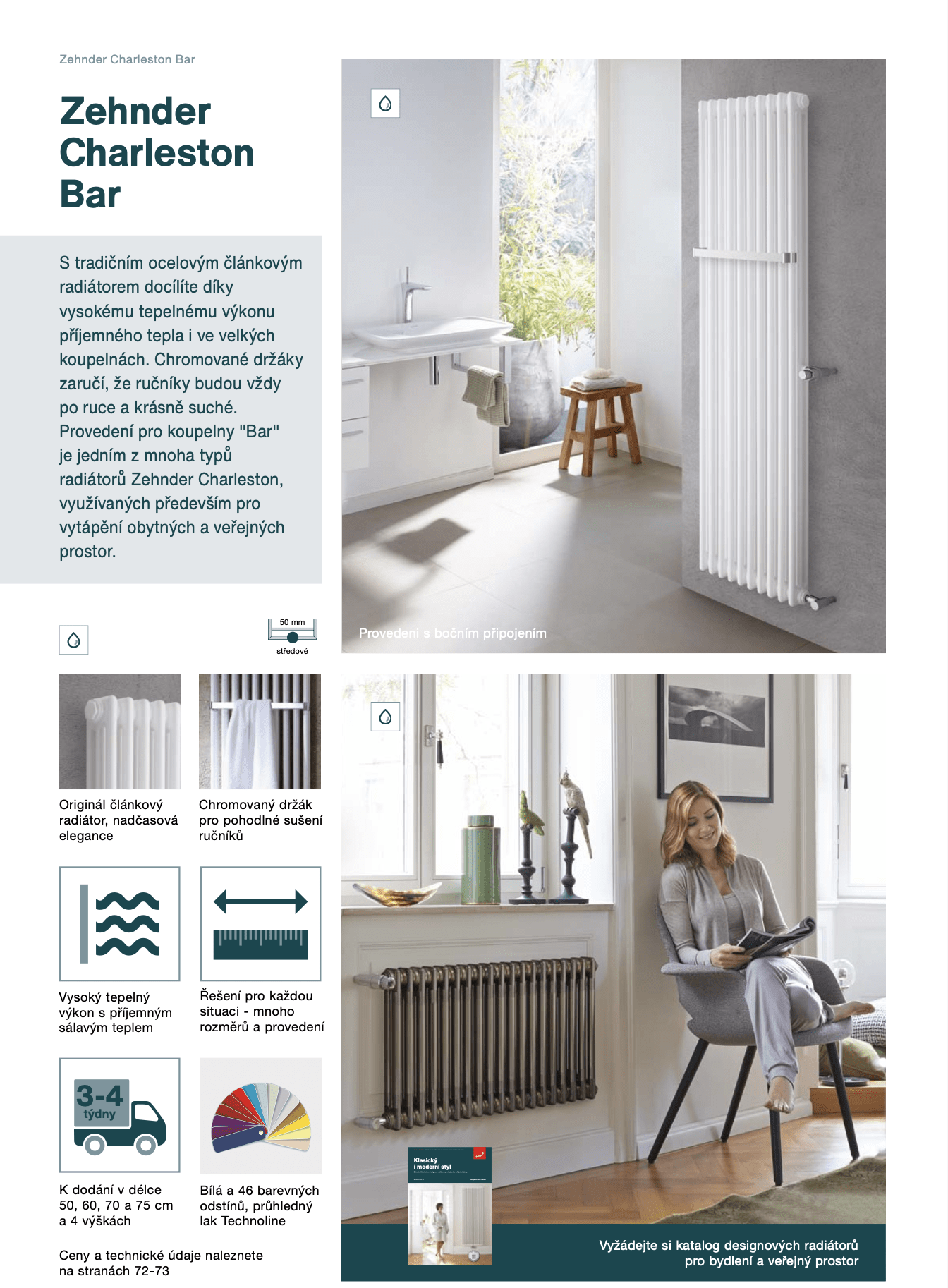 Vlivem velkého výkonu koupelnového radiátoru Zehnder Charleston Bar docílíte příjemného tepla i ve velkých koupelnách. Kromě toho budou suché velké a malé ručníky budou suché. Díky variabilně instalovatelnému držáku na ručník jsou ručníky vždy po ruce a předehřáté. K dostání téměř ve všech barvách a povrchových úpravách dle přehledu barev Zehnder.