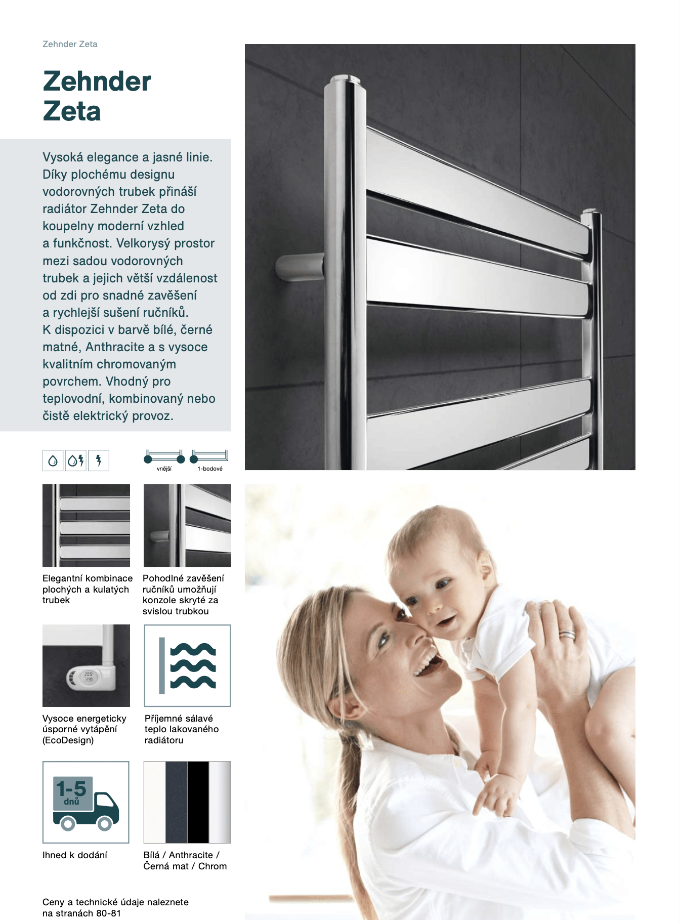 Vysoká elegance a jasné linie. Díky plochému designu vodorovných trubek přináší koupelnový radiátor Zehnder Zeta do koupelny moderní vzhled a funkčnost. Velkorysý prostor mezi sadou vodorovných trubek a jejich větší vzdálenost od zdi pro snadné zavěšení a rychlejší sušení ručníků. Sušák je k dispozici v bílé barvě a s vysoce kvalitním chromovaným povrchem pro teplovodní, kombinovaný nebo čistě elektrický provoz. Radiátor je dostupný s bílou a vysoce kvalitní chromovanou úpravou.