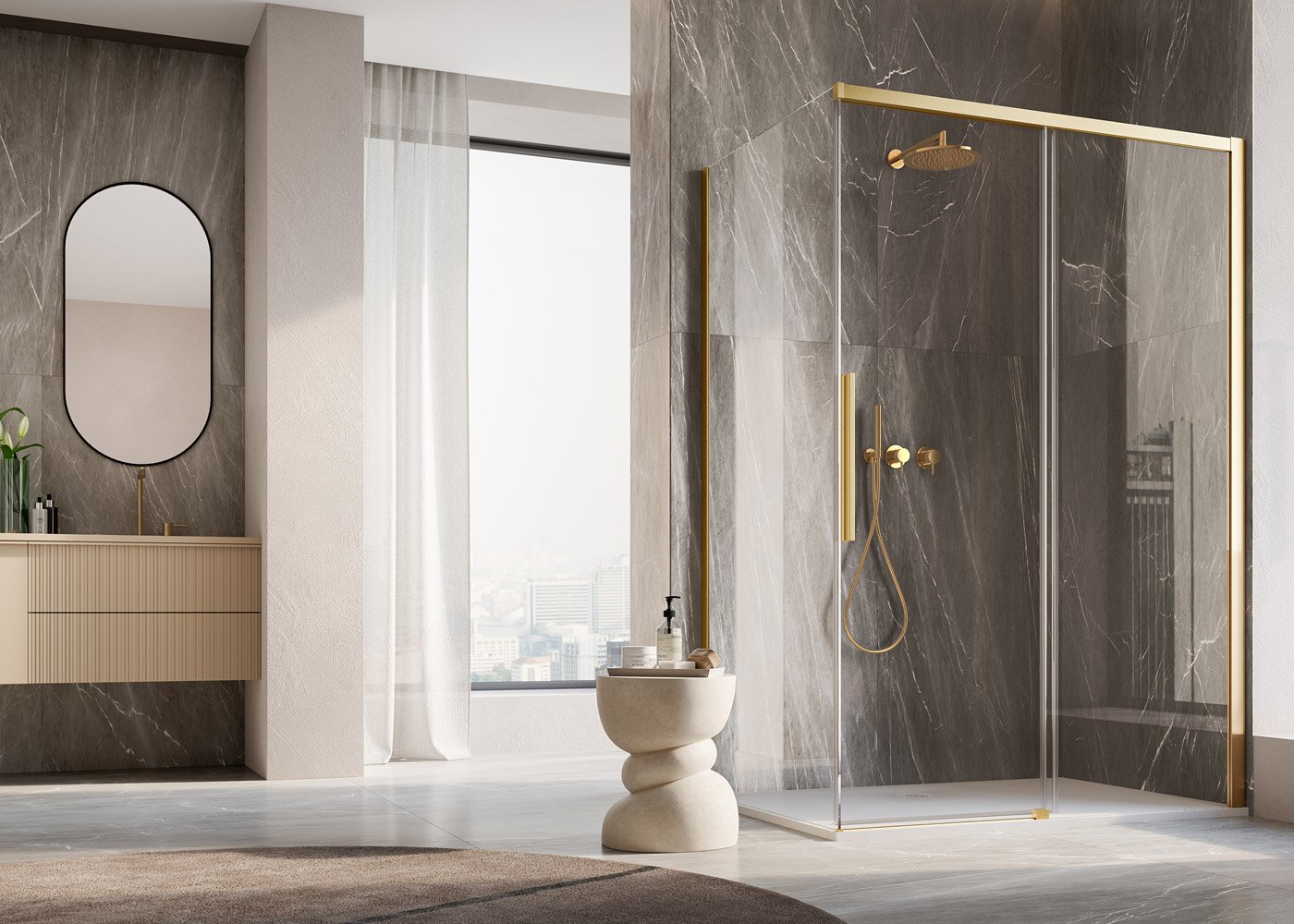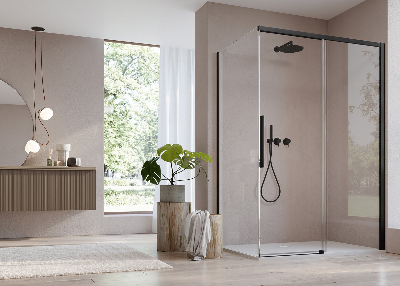 ORIANA – Jednodílné posuvné dveře s pevnou stěnou v rovině + Boční stěna v 90°