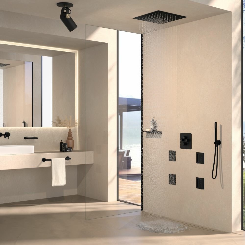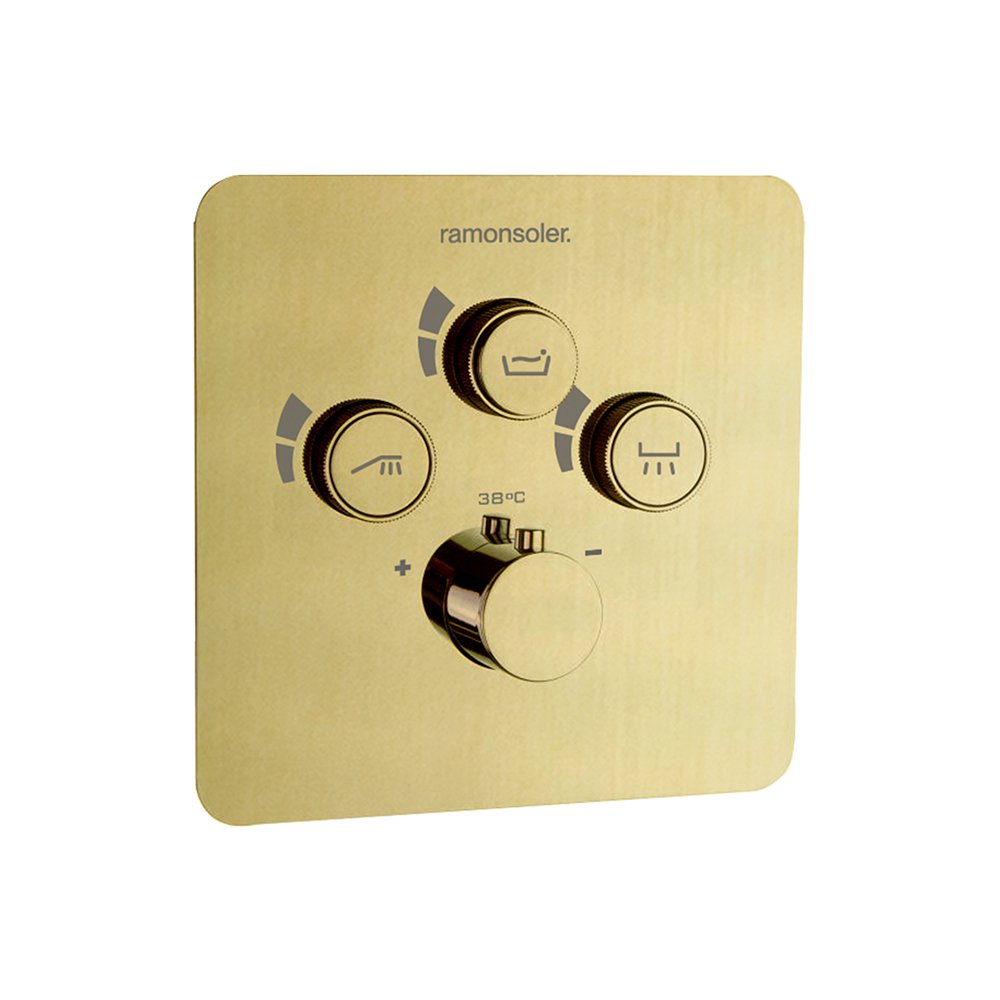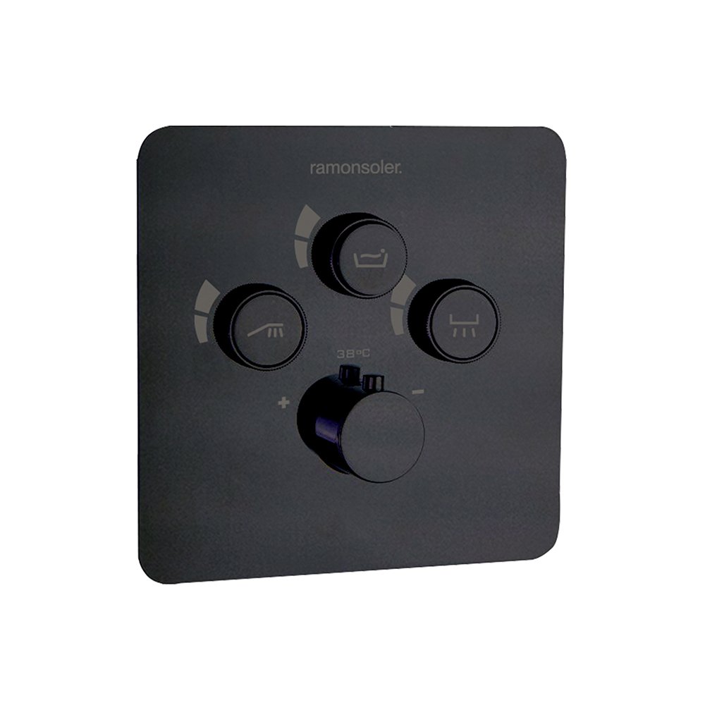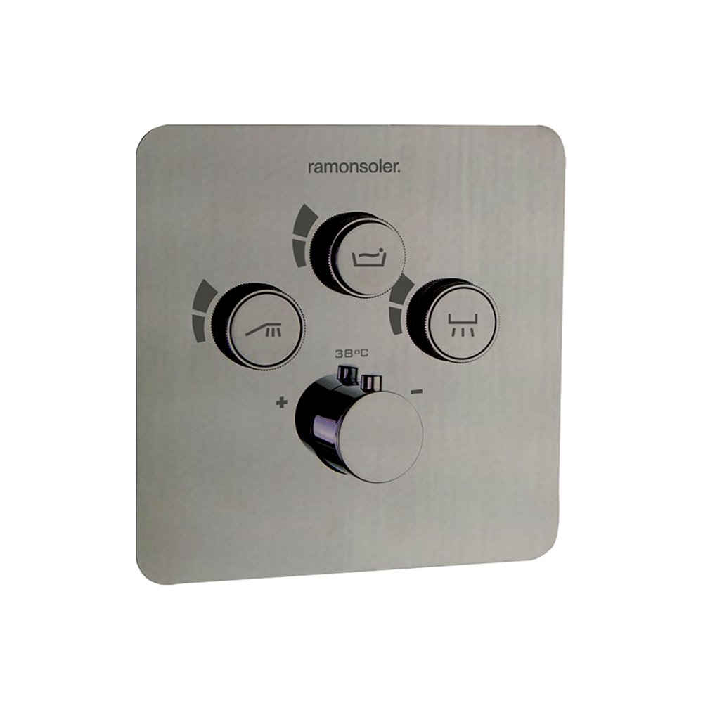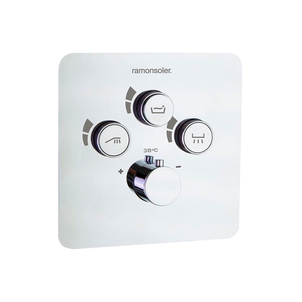 Podomítková sprchová baterie značky Ramon Soler, 3cestná. Nová generace chytrých baterií, která nabízí zcela personalizované a uživatelem řízené sprchování. Tento termostat pod omítku má dvojí funkční tlačítka pro volbu výkonu vody a pro regulaci teploty.